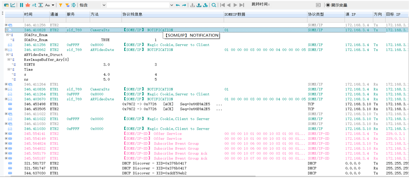SD服务发现、事件通知、请求响应、字段变更的全协议栈监控方案 在车载以太网SOME/IP通信验证中,快速捕捉 SD报文交互链、区分 RR/FF/Notification/Event报文类型 是诊断通信